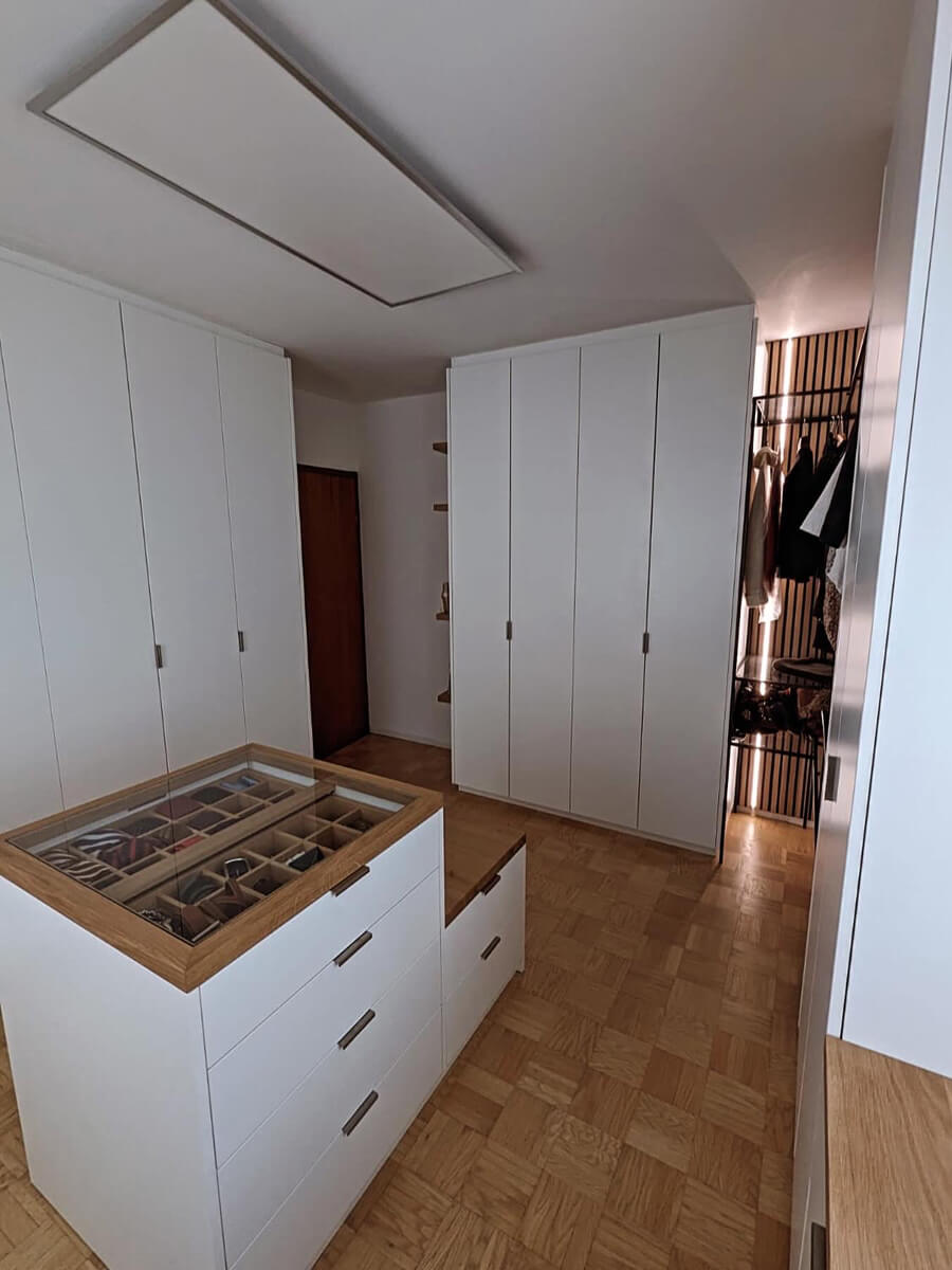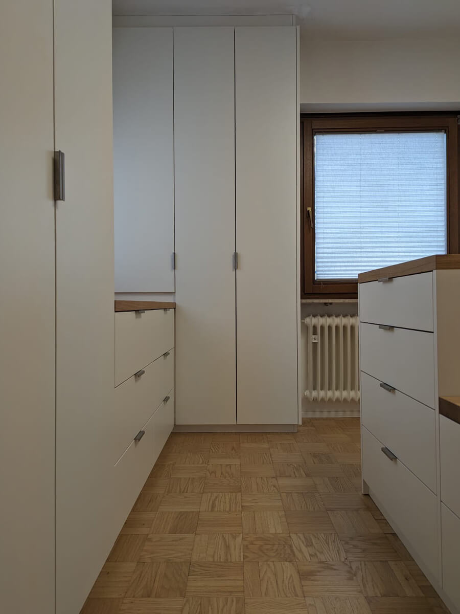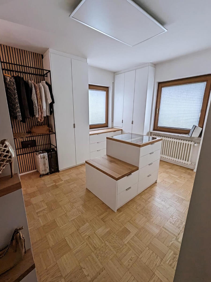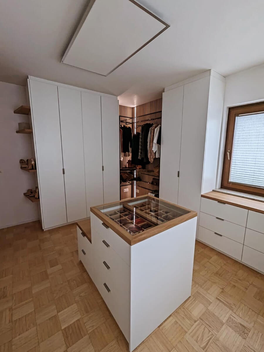 Ankleidezimmer Stauraum Stylisch. Eiche Massivholz trifft matt weiss.