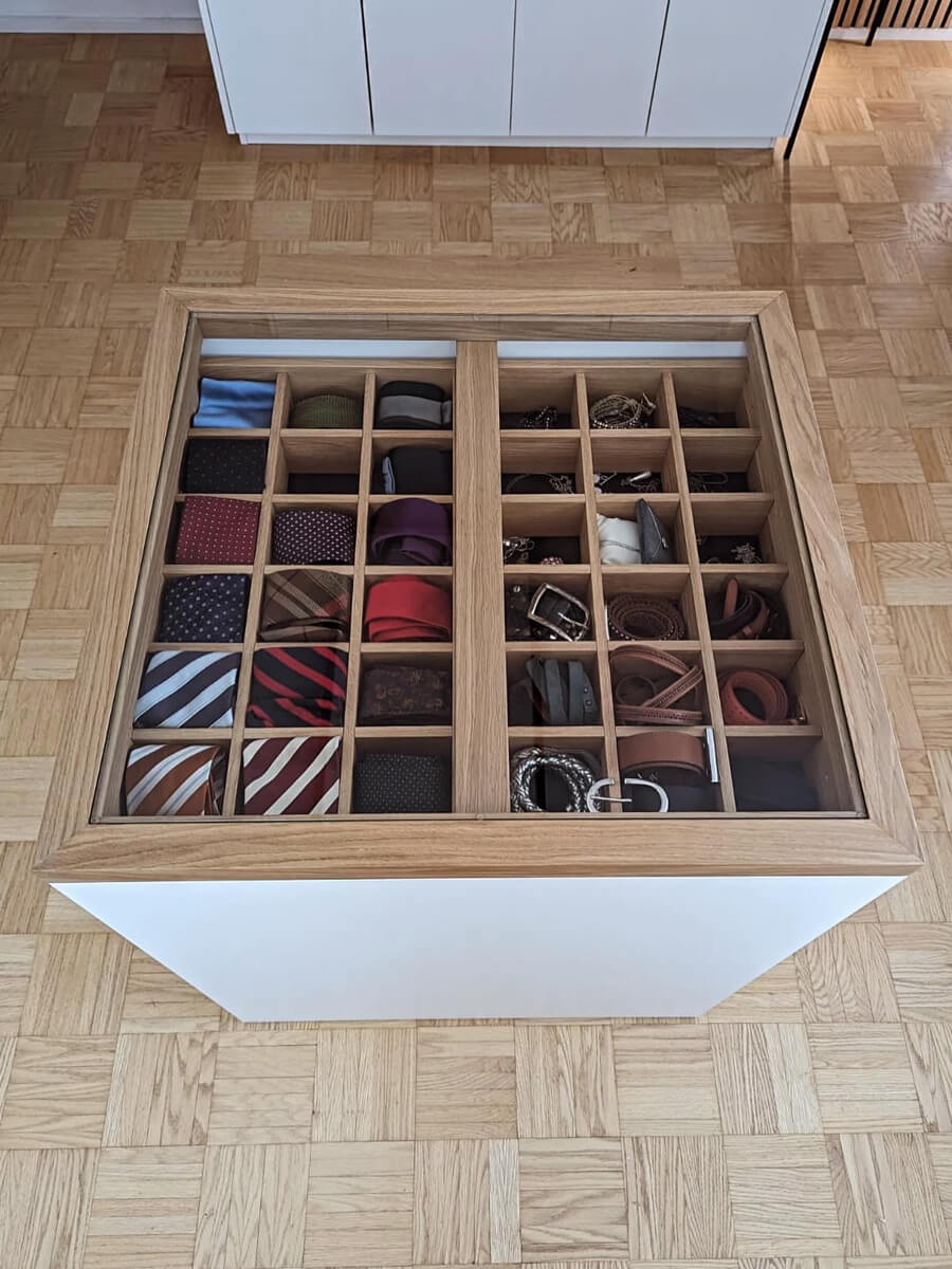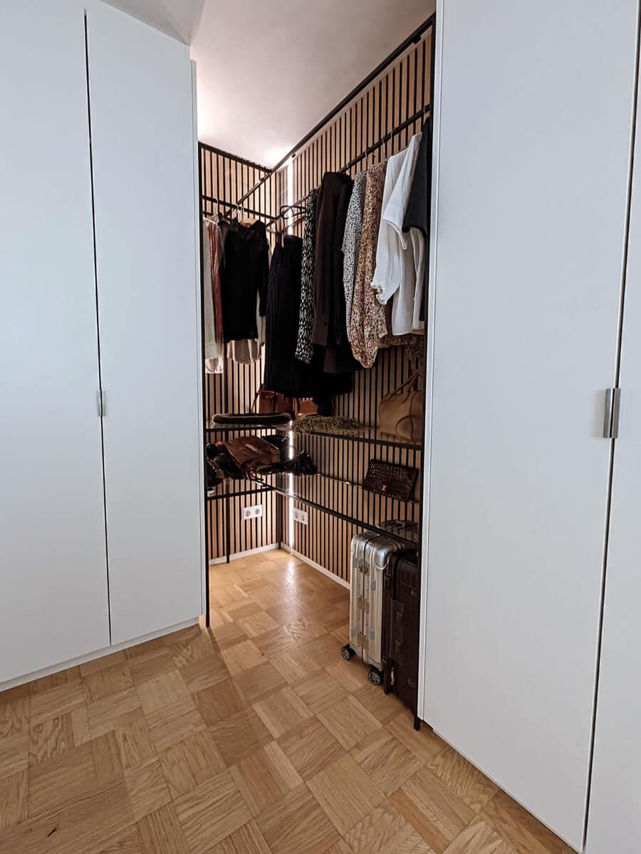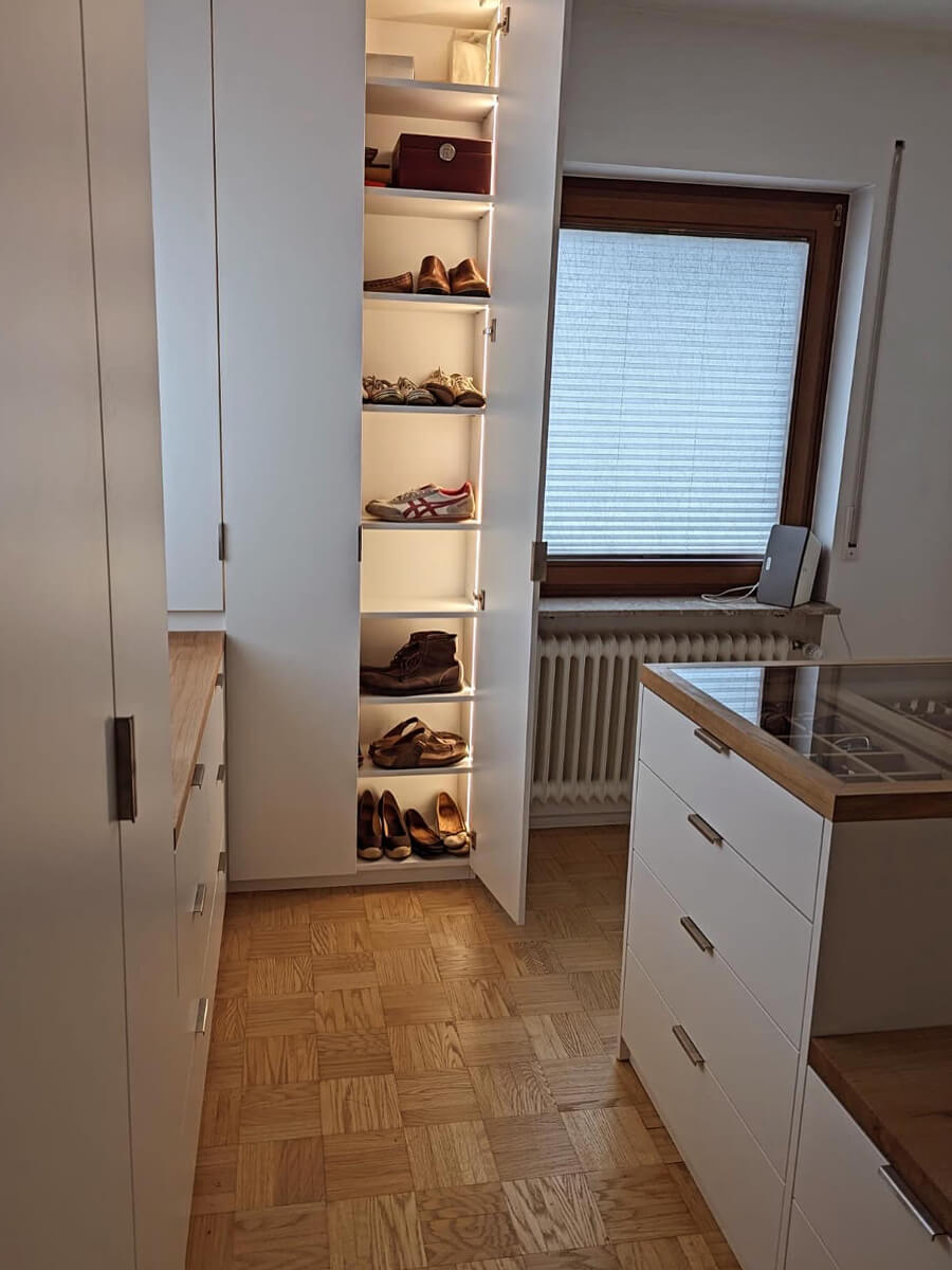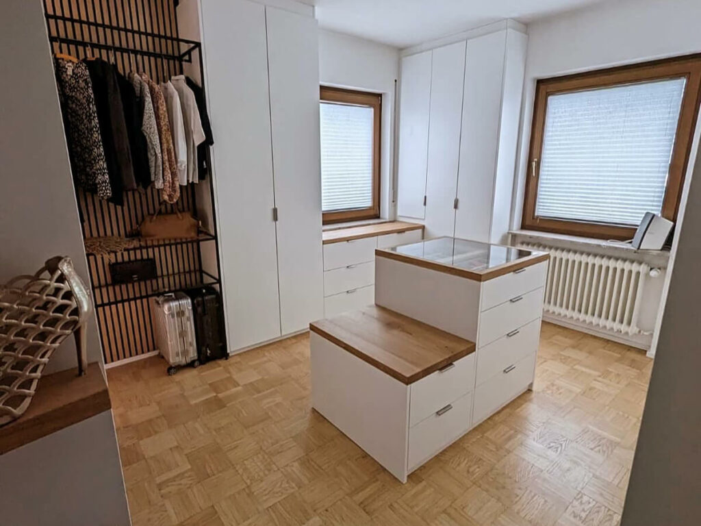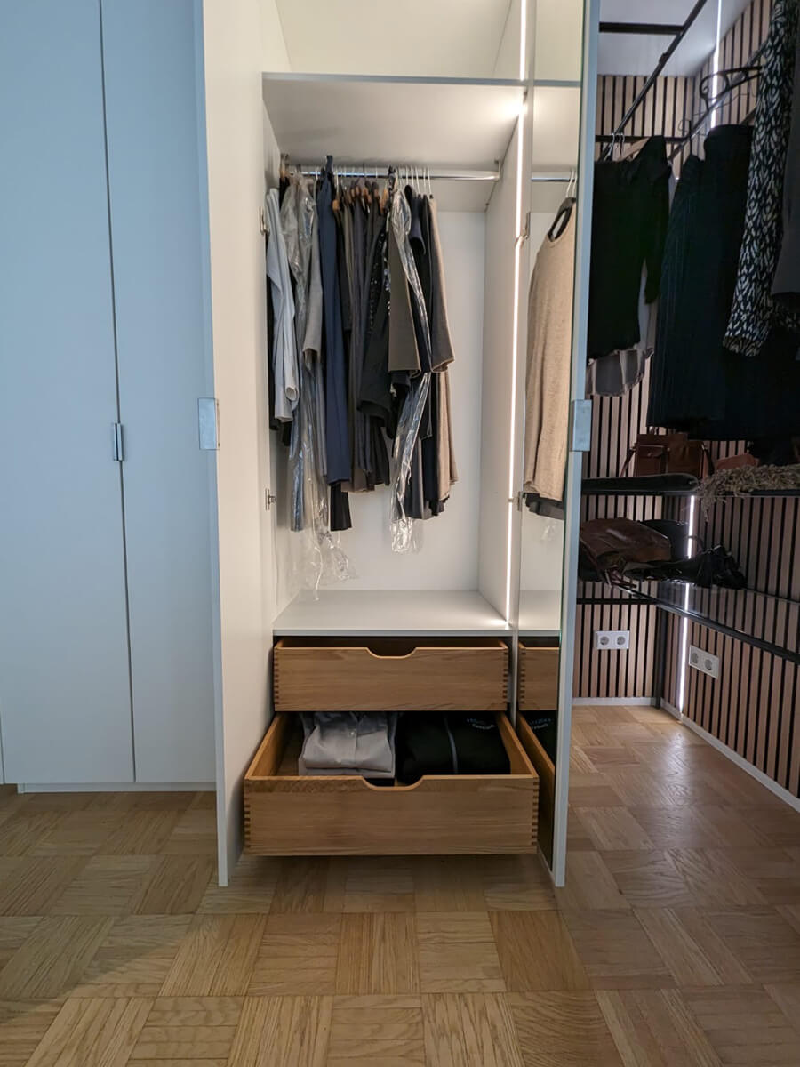 Ankleidezimmer Stauraum Stylisch. Eiche Massivholz trifft matt weiss.