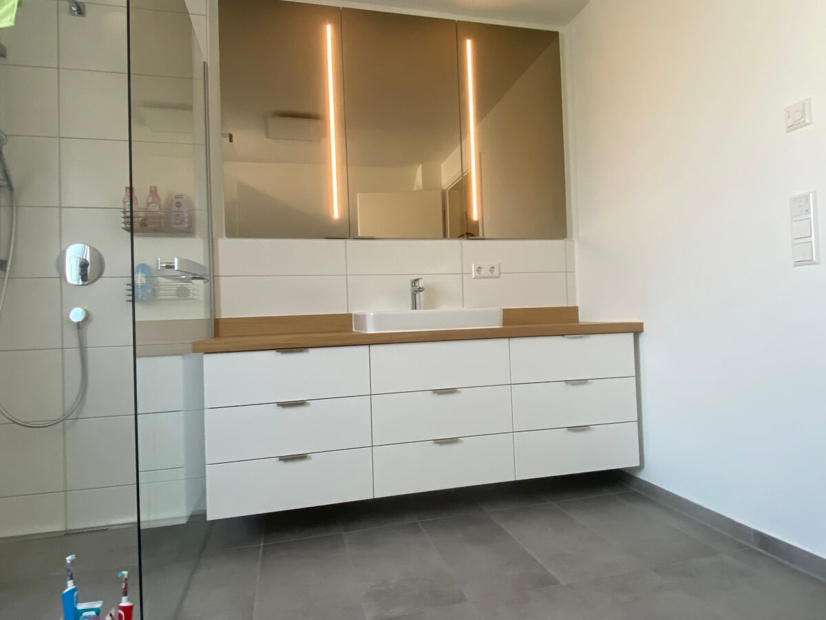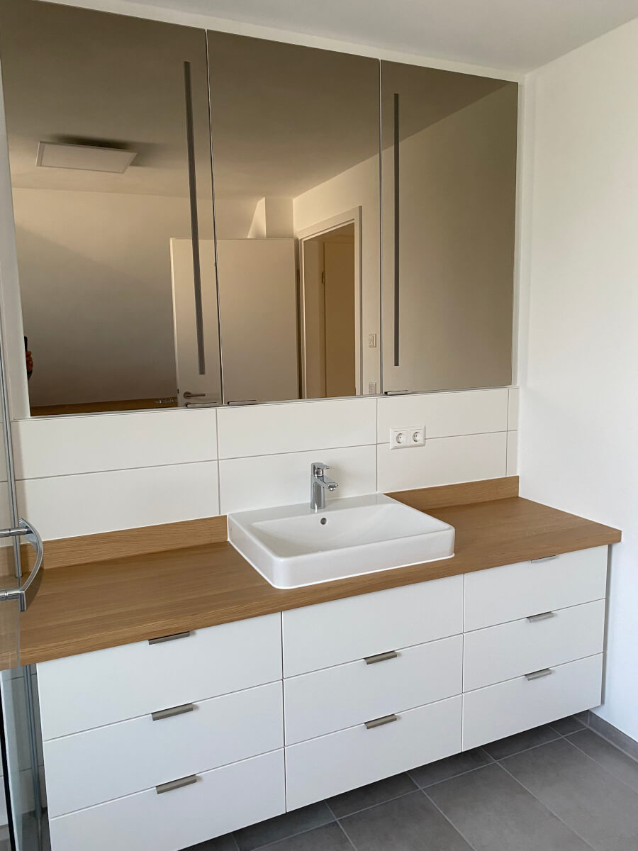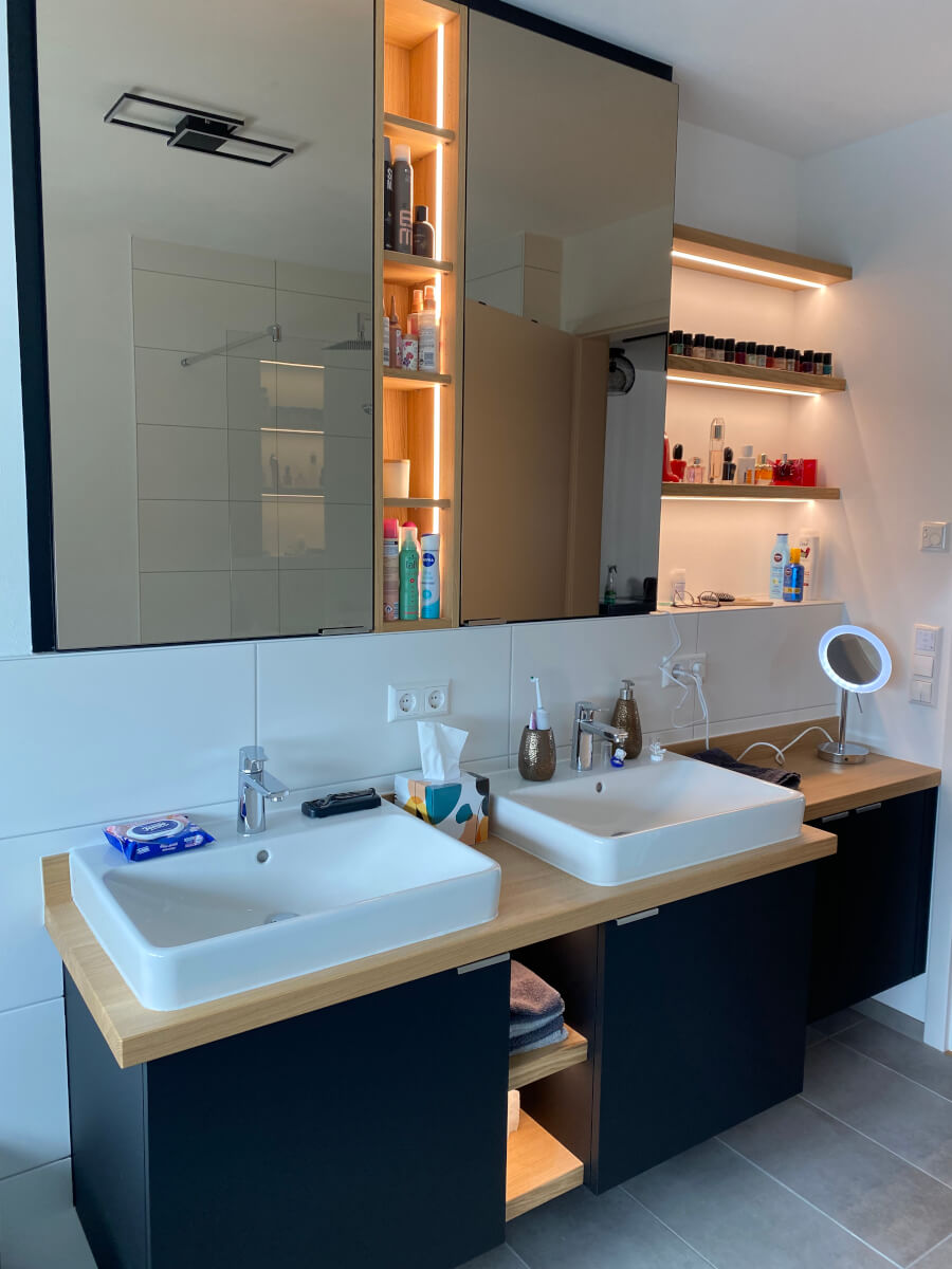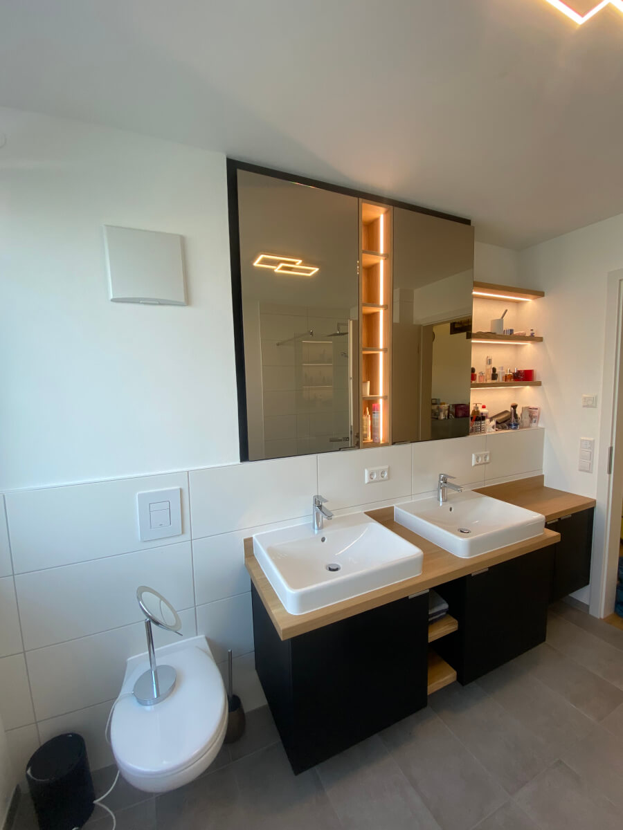 Bäder Möblierung: Spiegelschränke und Waschtische, Beleuchtungskonzept Bad und Dachschrägen- Schrank. Fenix und Eiche Massivholz.