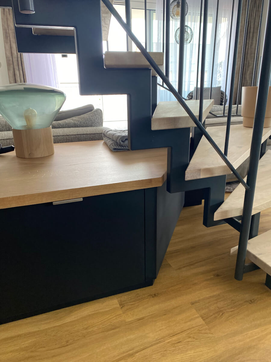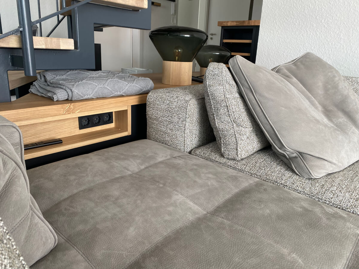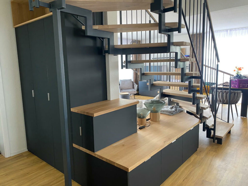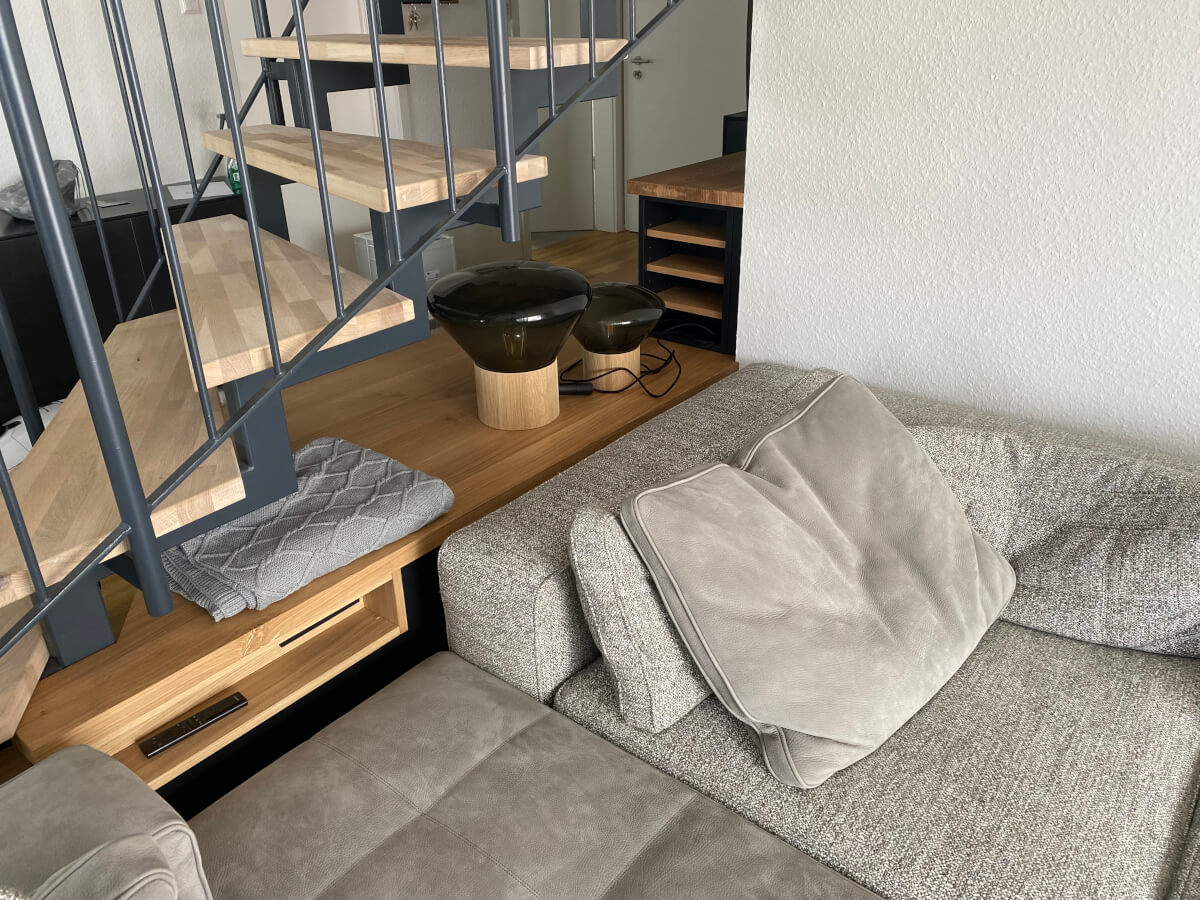 Das war definitiv die richtige Entscheidung. Die Bäder sind super schön und sehr hochwertig. Das Highlight, ist aber unser multifunktionales Möbel unter der Treppe. Hier hat die Firma Baunach Plan Garderobe, Schuhschrank, Sitzbank und Wohnzimmermöbel vereint. Der Stauraum unter der Treppe kann jetzt Optimal ausgenutzt werden und ist trotzdem ein offener Wohnbereich.