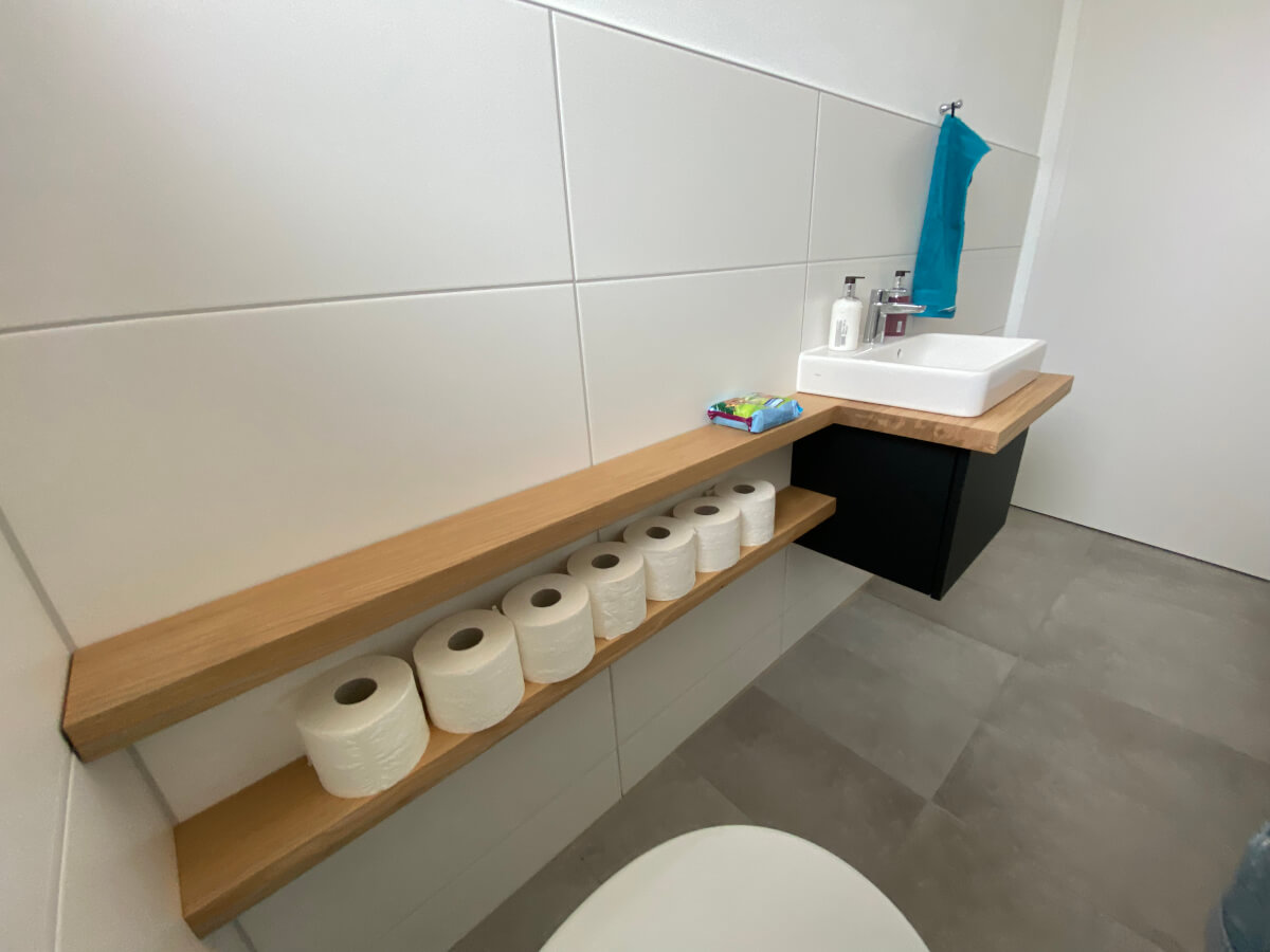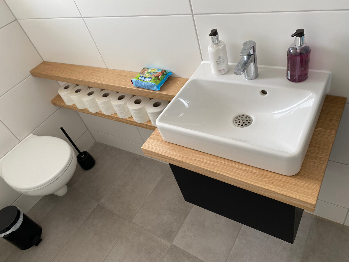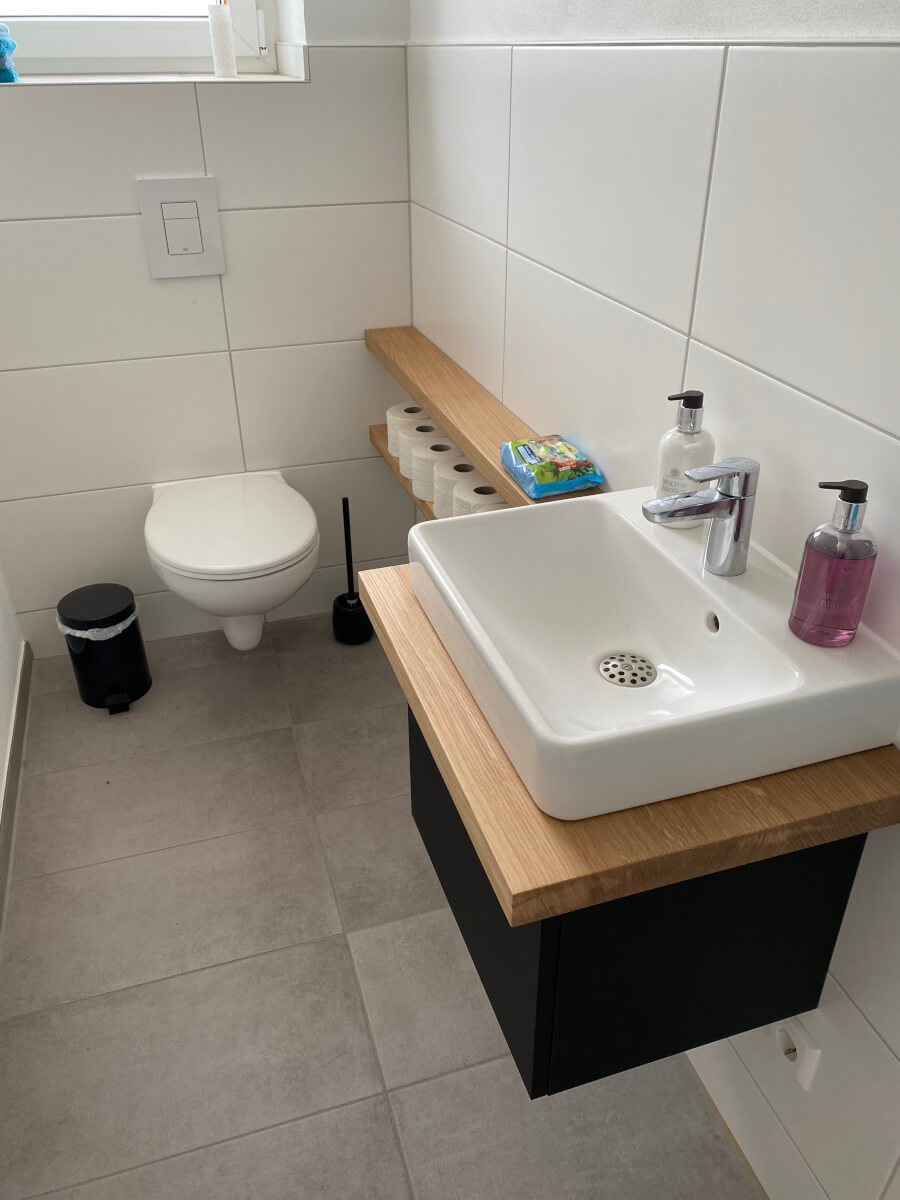 Gäste WC: Waschtisch und Regale. Fenix und Eiche Massivholz