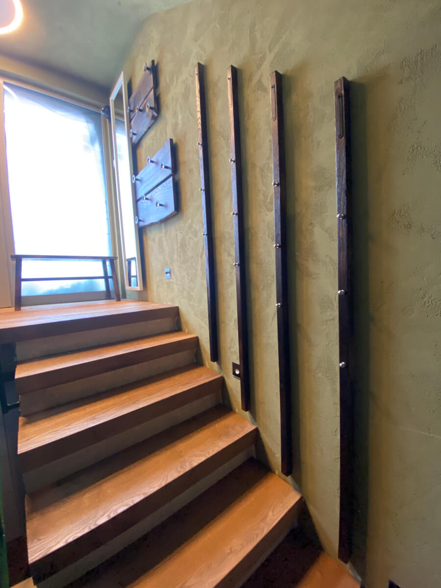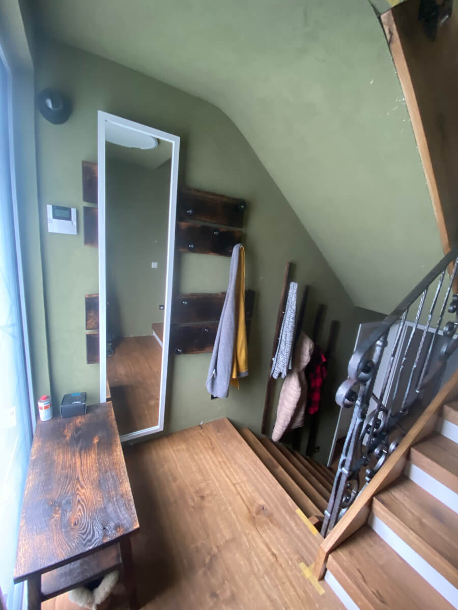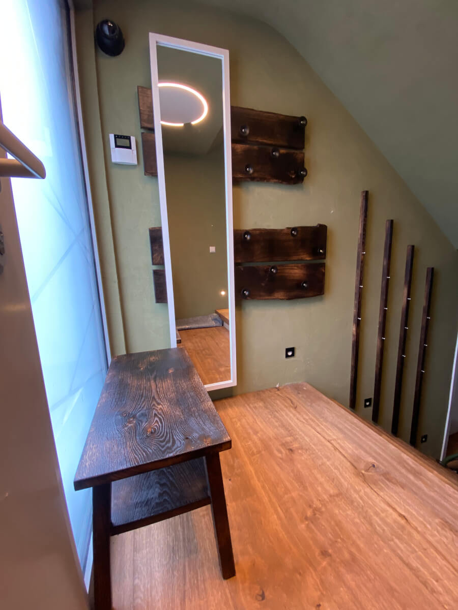 Garderobe EG: Sitzbank in yakisugi, Spiegel und Kleiderhaken.